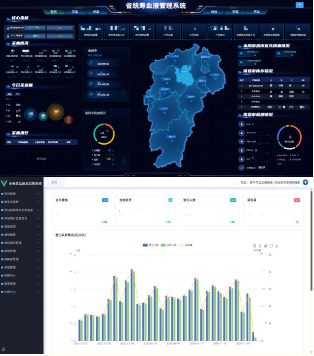 2025年,全省统筹血液管理系统全面启动建设,核心功能已初步落地。系统整合全省12家血站、18家浆站核心业务数据,搭建省级统一血液信息数据中心与指挥平台;实现与全省二级以上医疗机构联网对接,构建全链条血液与血浆信息监管体系;同步上线献血者移动服务门户,部署用血直免系统,建成全省血液移动管理体系。目前,系统已实现血液及血浆信息全流程可追溯、不宜献血人员信息自动核查屏蔽,通过指挥信息子系统达成采供血业务数据 “一屏统览”,为全省血液管理智能化、精细化发展提供坚实支撑。