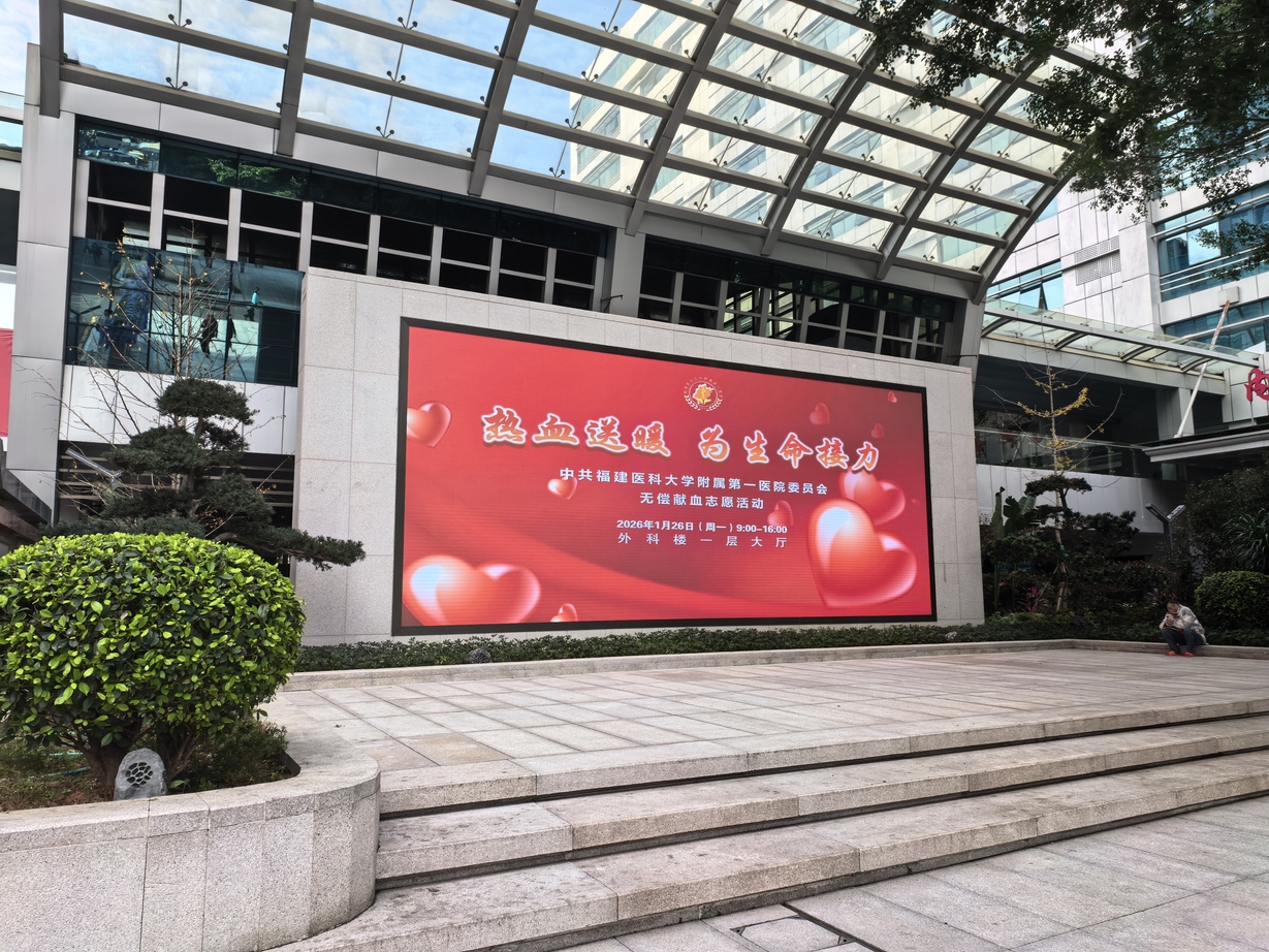 2026年1月26日,福建医科大学附属第一医院茶亭院区与奥体院区同步开展以“热血送暖,为生命接力”为主题的无偿献血活动。本次活动成功献血165人,献血总量为5.4万余毫升。