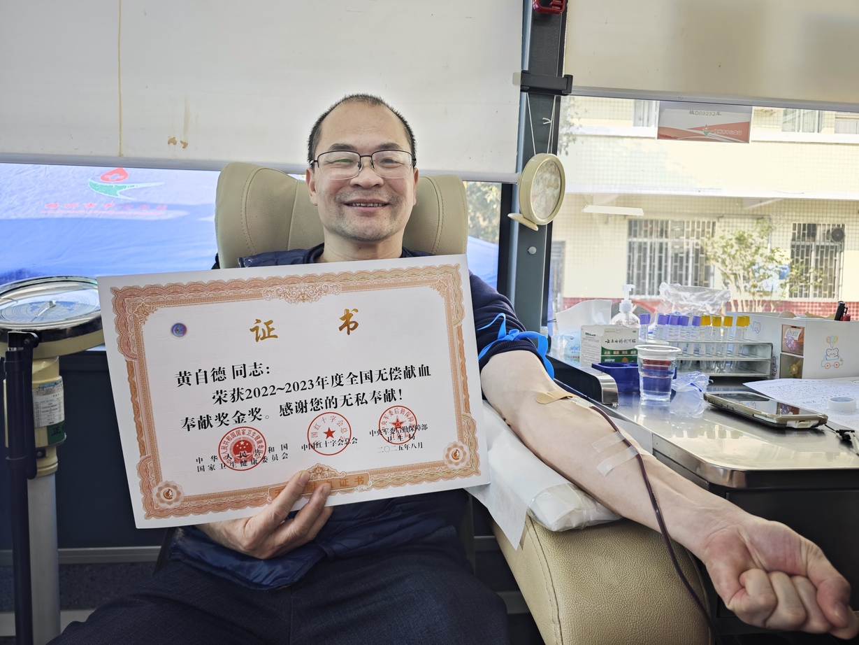 人群中,多位“老献血者”的身影格外引人注目,他们中不乏连续献血二十余年的资深奉献者。黄自德累计献血量已达9800毫升,相当于一个成年人全身血液总量的两倍。“从第一次献血到现在,看着献血获奖荣誉越来越多,就知道自己的热血帮助了更多人。”全国无偿献血奉献奖金奖的黄自德一边配合采血一边说道。
