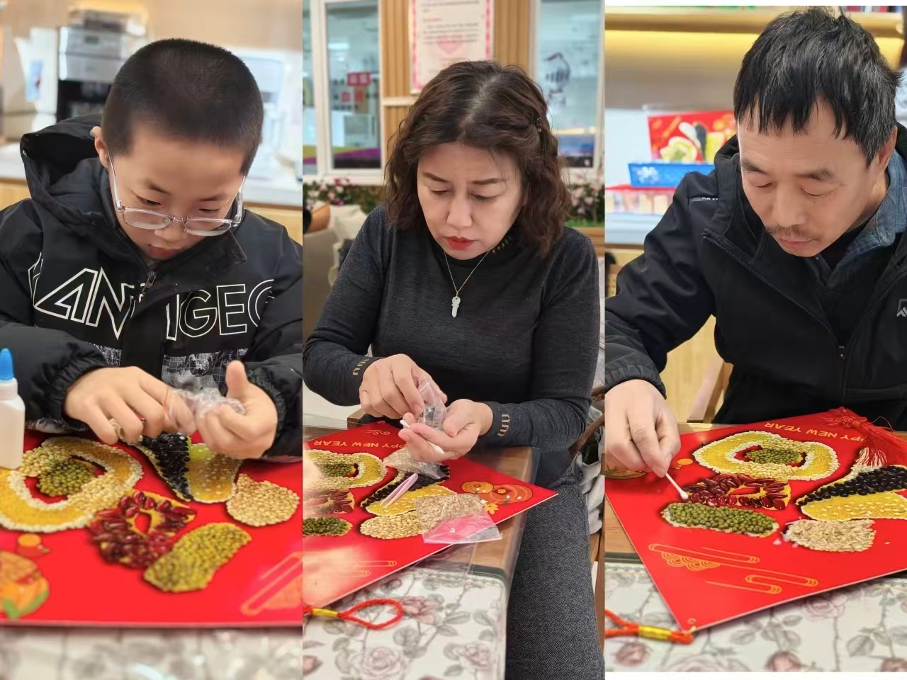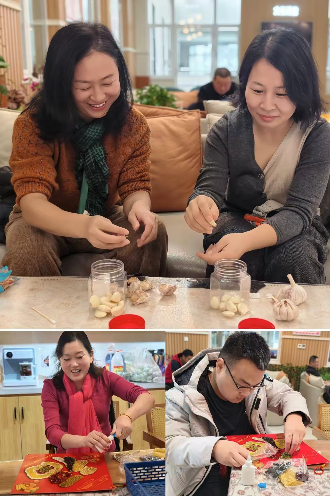活动现场趣味与温情交织,众人围坐一堂沉浸式解锁多重传统民俗体验:红底烫金的福字铺展案前,大家手持圆润的糯米、饱满的红豆、金黄的小米等腊八粥食材,细心粘贴、巧思排布,亲手打造寓意“五谷丰登、福运绵长”的“五谷福联”。每一粒谷物都承载着对生活的美好期许,每一次粘贴都饱含着同心向善的热忱;随后,新鲜的蒜头、醇厚的香醋与精致玻璃罐整齐摆放,大家围坐一起亲手装罐、密封腌制,在剥蒜、倒醋的轻松互动中拉近距离、增进情谊,静待蒜瓣在时光里褪去辛辣、染上晶莹翡翠色;与此同时,食堂精心熬煮的腊八粥早已香气氤氲,软糯的米粒裹挟着各色果仁,一碗热粥下肚,暖身更暖心,既传递着腊八节日的传统祝福,更盛满了保定市中心血站对每一位献血者无私奉献的敬意与感恩。