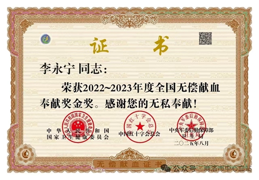 点滴善举,终获荣光。凭借多年来的无私奉献,李永宁先后荣获“全国无偿献血奉献奖金奖、银奖、铜奖”“2020-2021”年度全国无偿献血奉献奖终身荣誉奖”等多项荣誉,这些沉甸甸的奖章,是对他二十余载热血坚守的最好肯定。