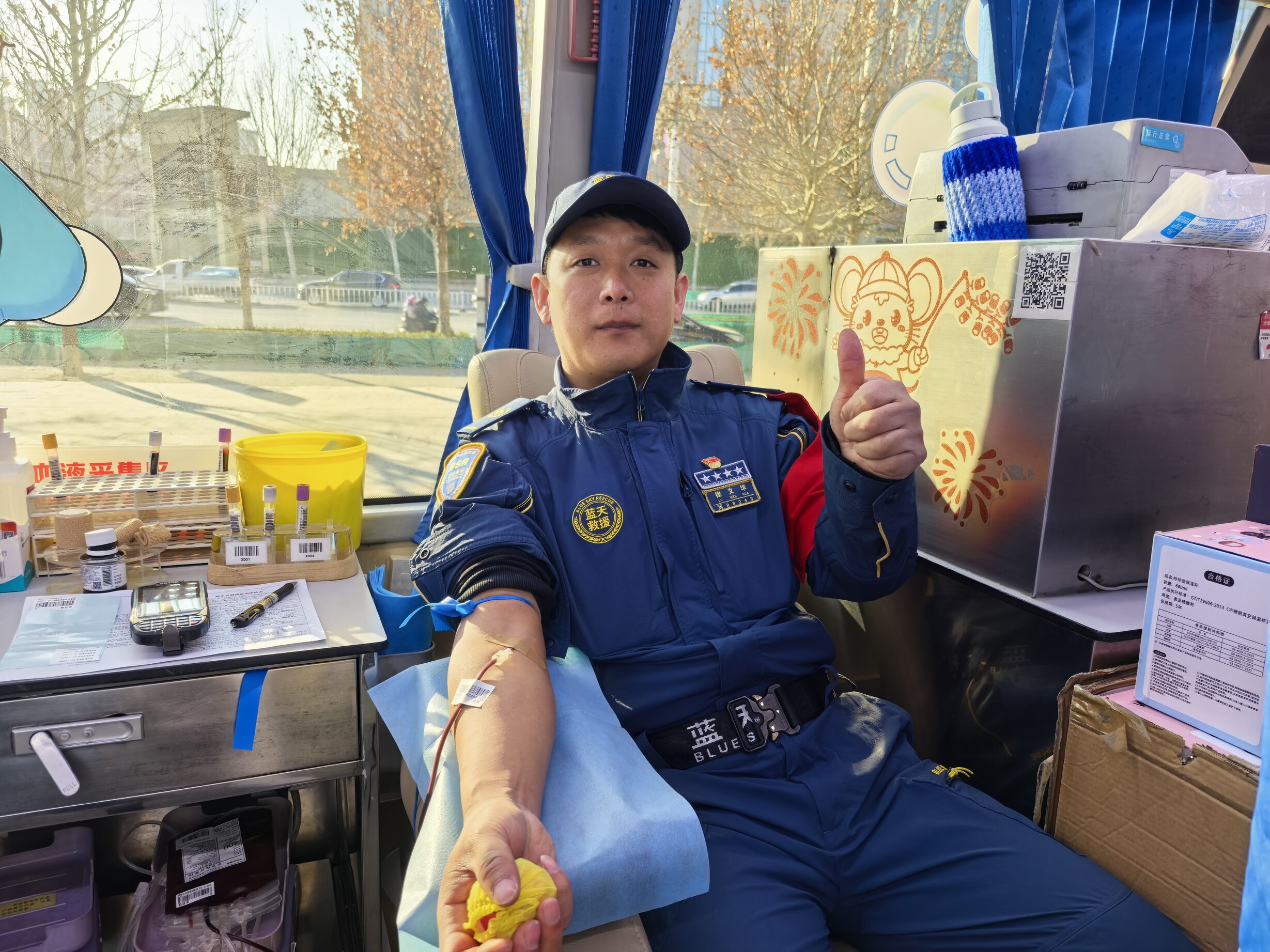 六载春秋,初心如磐。从2020年到2026年,每一个新年伊始,队员们都主动放下节日的休闲,准时集结在献血车。填表、初筛、采血,一系列流程熟练而有序,手臂上的针孔是他们的“新年勋章”,鲜红的献血证是他们的“爱心贺礼”。有的已是多次献血的“老先锋”,有的是首次参与的“新力量”,但每个人的脸上都洋溢着坚定与自豪。“作为救援队员,我们见过生命的脆弱,更懂血液的珍贵。用一次献血开启新年,是最有意义的选择。”队员们的话语,道出了救援人与生俱来的责任与担当。采血过程中,大家互相叮嘱注意事项,分享献血心得,蓝色队服汇聚成一片温暖的海洋,感染着现场的每一个人。