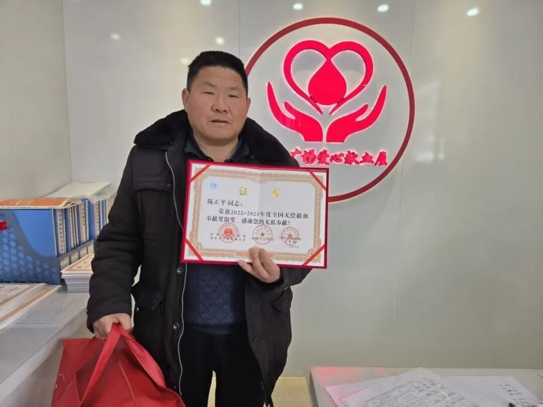 自第一次踏上献血车起,只要身体条件允许、血站有采血需求,他总会准时赴约,从不推诿、从不缺席,献血记录从最初的200毫升到7200毫升,农忙时节他早早下地劳作,匆匆吃完午饭便赶往采血点;寒冬腊月,他顶着凛冽寒风骑行十几公里,只为不耽误献血时间。有人问他图什么,他总是憨厚一笑:“庄稼人不懂啥大道理,能通过自己的微薄之力帮到他人,就是最大的满足”。当全国无偿献血奉献奖银奖的荣誉证书递到他手中时,陈正平依旧保持着谦逊:“只要身体允许,我会一直献下去,直到不符合条件为止。”