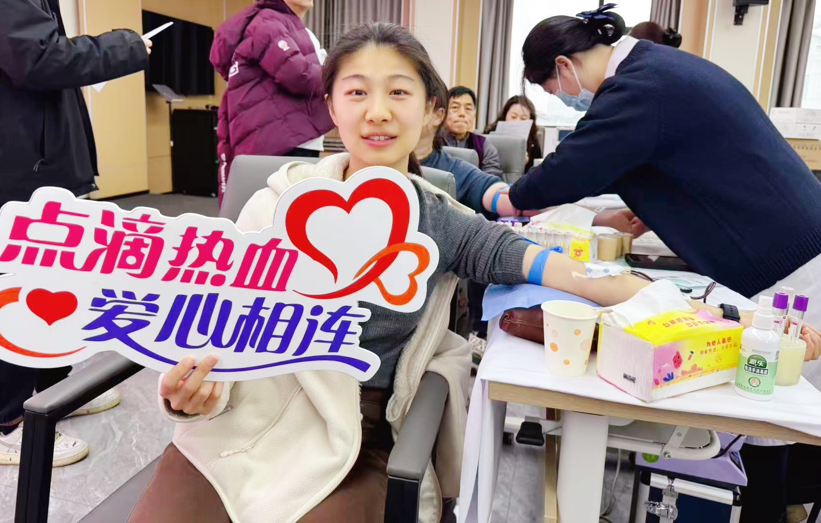 该院人事科的张敏,这是她第二次献血,她说:“每一滴热血都有可能拯救一个生命,这让我感到很自豪。”