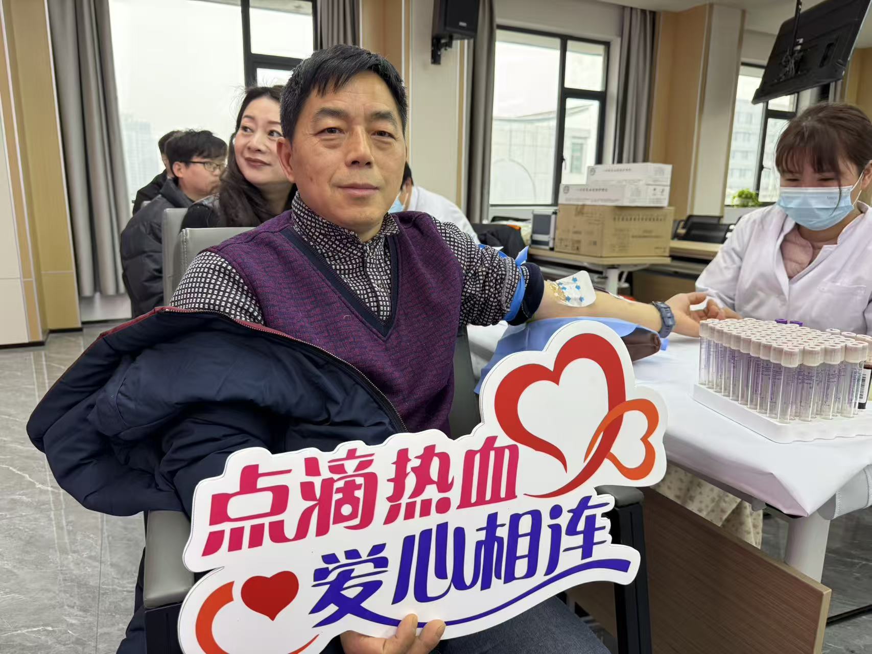 来自总务科的徐爱军,他表示:“献血不仅可以延续生命,还可以传递爱心。我已经参加了12次献血,每一次都是对生命的支持。”