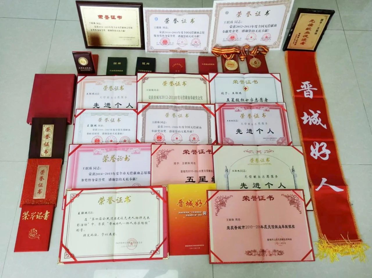 面对镜头,身着朴素便装的王联珠搓了搓冻得微红的手,笑容憨厚:“这奖不是给我一个人的,是给所有一起献血、一起宣传的志愿者兄弟姐妹们的!”话虽朴实,但他胸前的荣誉簿却“讲述”着不凡:连续8次获得晋城市“无偿献血先进个人”,从“2006—2007年度”全国无偿献血奉献奖铜奖到“2014-2015年度”志愿服务终生荣誉奖,再到如今的“特别奖”——这份国家级最高荣誉,是对他24次无偿献血(累计9600毫升)、19年志愿服务6656小时最有力的注脚。