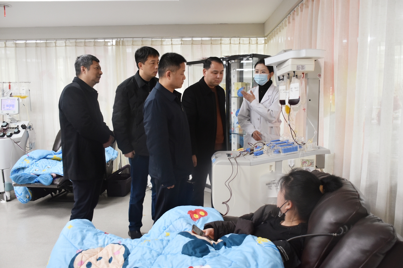 涂晓明一行来到机采血小板大厅、供血科、检验科、质量管理科、输血研究室等一线科室,向工作人员致以春节的问候。他边参观边现场询问机采血小板采集流程、血液储存管理、血液库存动态等工作,与一线工作人员亲切交流,对血站规范的业务操作、完善的保障体系和工作人员的敬业精神给予肯定。