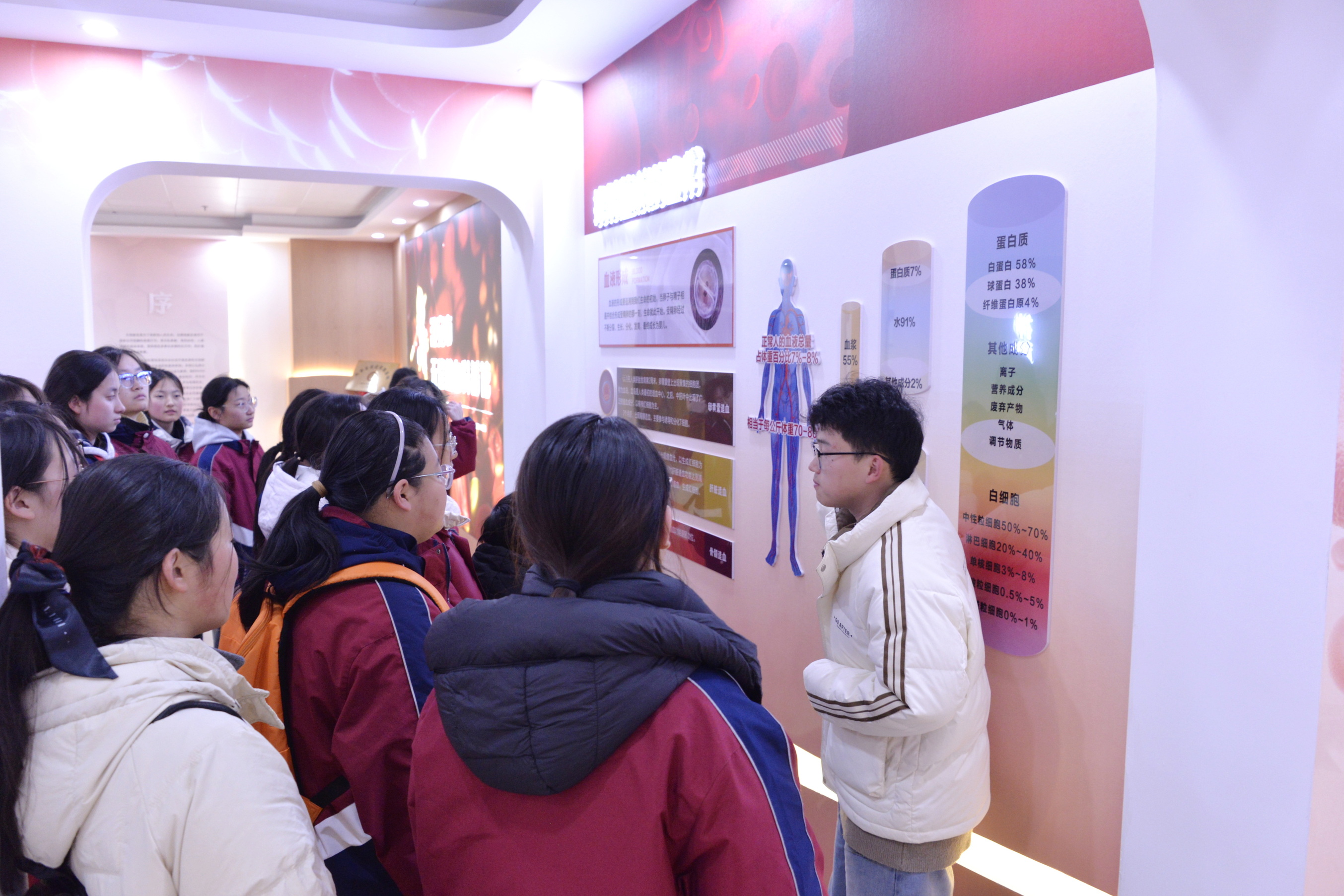 在无偿献血科普馆,讲解员以生动易懂的方式,为同学们揭开了血液的奥秘。从血液的组成与功能、血型的遗传规律到输血技术的发展历程,再到无偿献血的政策与意义,同学们听得聚精会神,不时举手提问,现场气氛热烈。在5D 影院,同学们“钻进”血管,在微观的世界里与血细胞同行。知识抢答环节,更是将气氛推向高潮,同学们争相抢答,巩固了所学知识。