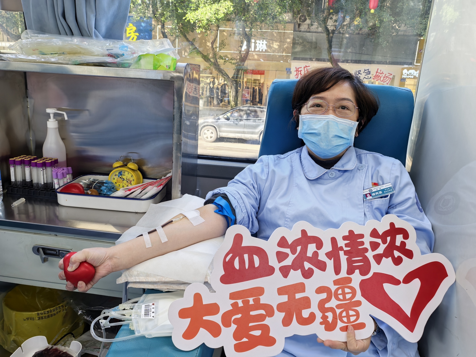 一个个党员卷起袖子、握紧拳头,一袋袋新鲜血浆汇聚成一条涌动的爱河,拳拳爱心溢于言表,有着多次献血经历党员同志傅秀英在献出400ml血后朴实地说:“作为一名党员,参加无偿献血活动我感到很光荣,作为一名医务人员,自己的血液能拯救患者我感到很开心”。