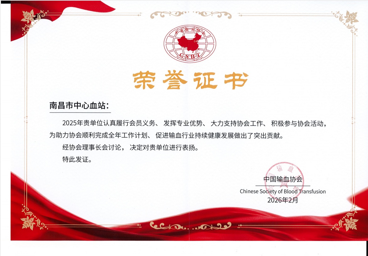 近日,中国输血协会公布2025年度获得表扬会员单位,南昌市中心血站凭借扎实的工作作风、突出的行业贡献及对协会工作的全力支持,成功获表扬,这份荣誉是行业对血站专业能力与责任担当的高度认可。