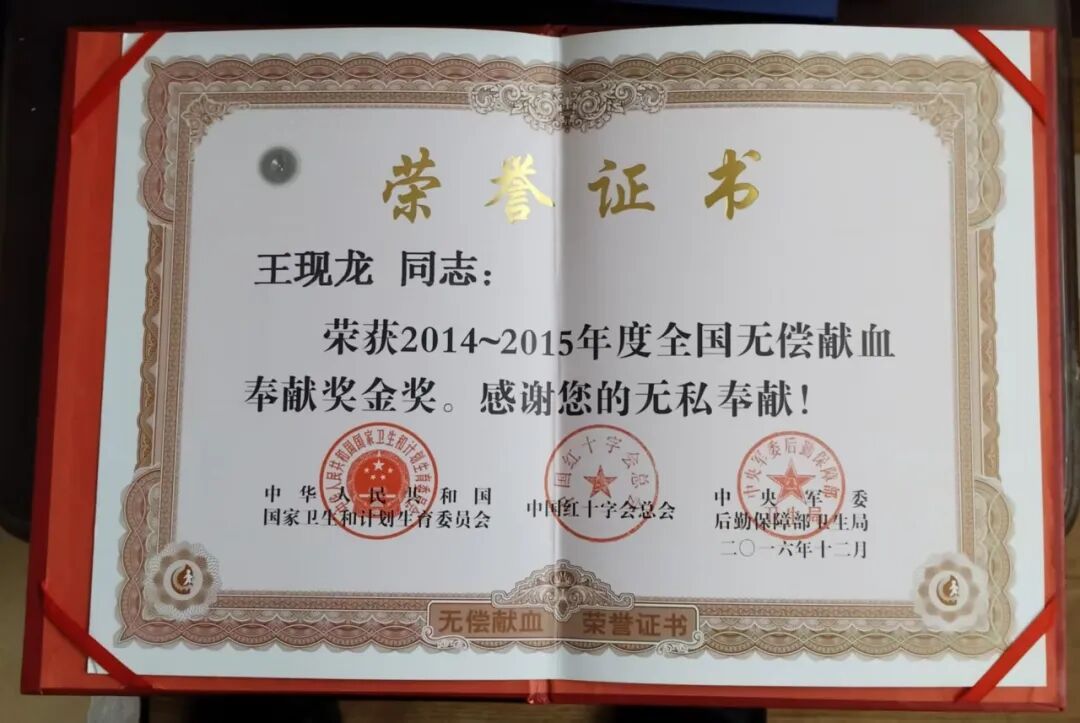 如果说父爱是让他踏上献血之路的初心,那么浓浓的孝心则是促使他坚定前行的动力。2017年,王现龙的母亲因病住院输血,凭着多年献血积累的献血证,他顺利为母亲报销了2000余元血费。这次经历让他真切感受到无偿献血的福利政策,也深刻体会到,献血不仅是利他之举,也是利己利家的善举,这份双向的温暖,让他更加坚定了献血的信念。