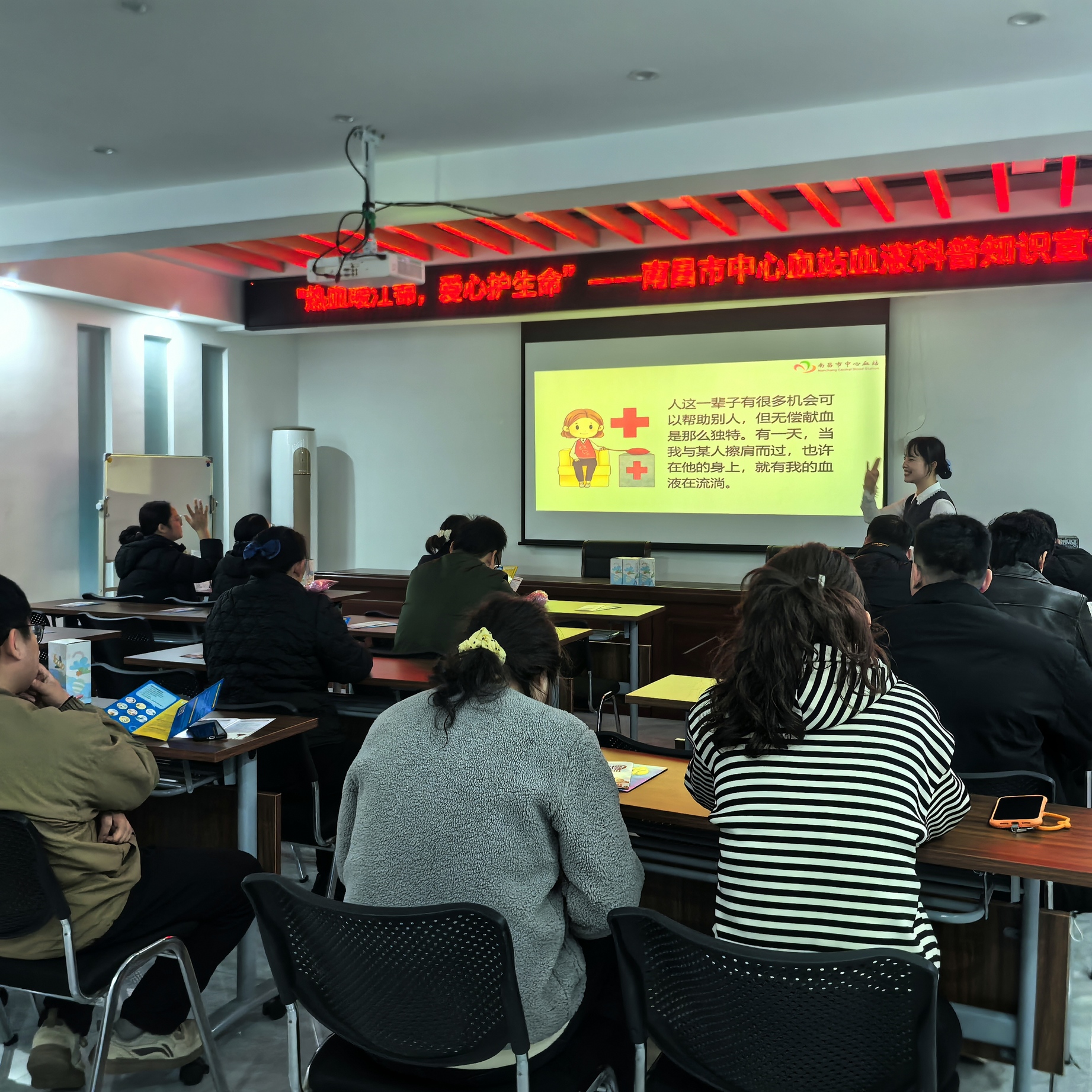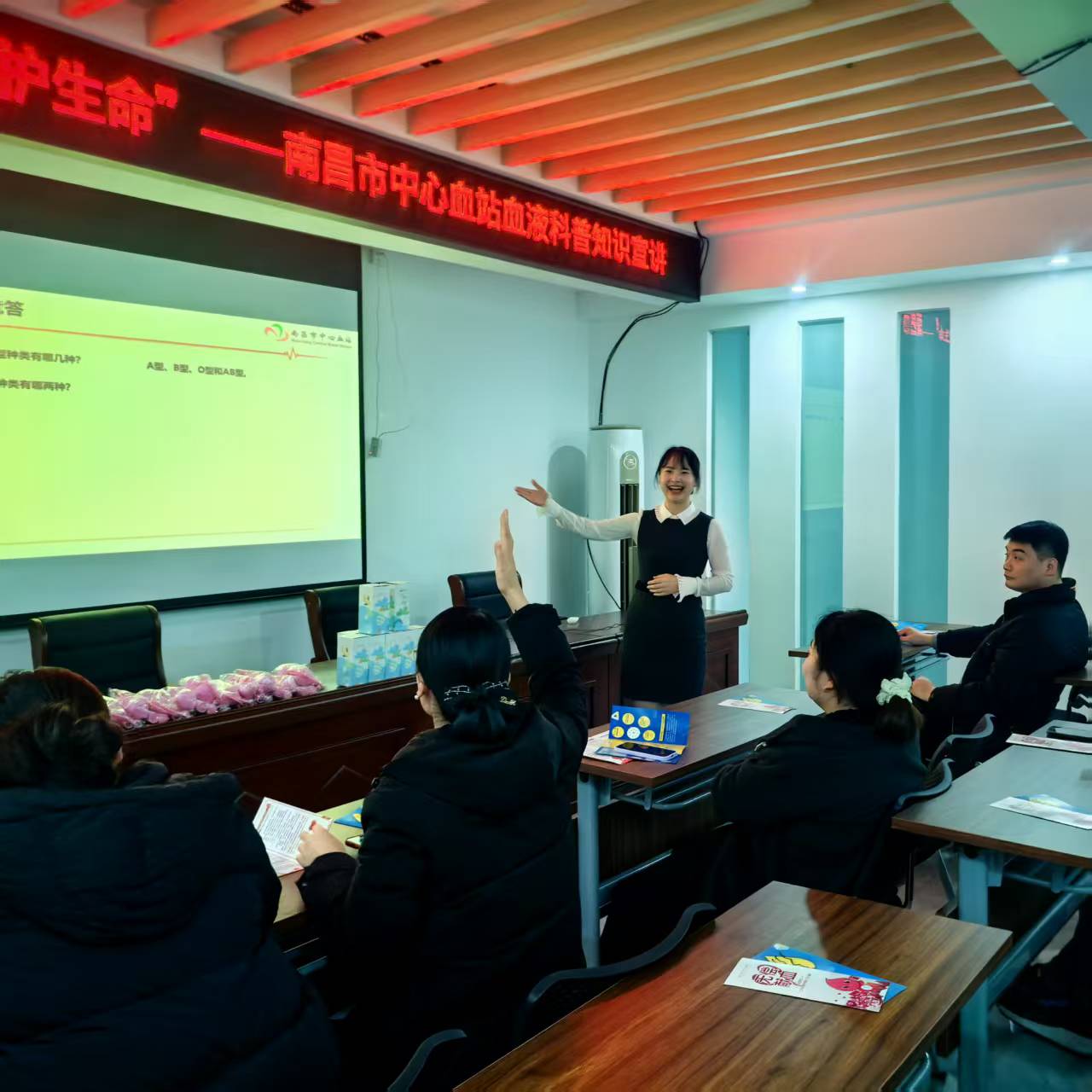 在互动提问环节中,现场气氛持续高涨、格外热烈。大家纷纷举手,我站工作人员也围绕献血者“三免”政策、用血报销流程、献血间隔时间以及机采血小板等大家普遍关心的问题积极解答,让大家听得明白、记得清楚。宣讲现场交流氛围轻松融洽,邻里之间的爱心共鸣在问答间不断升温。