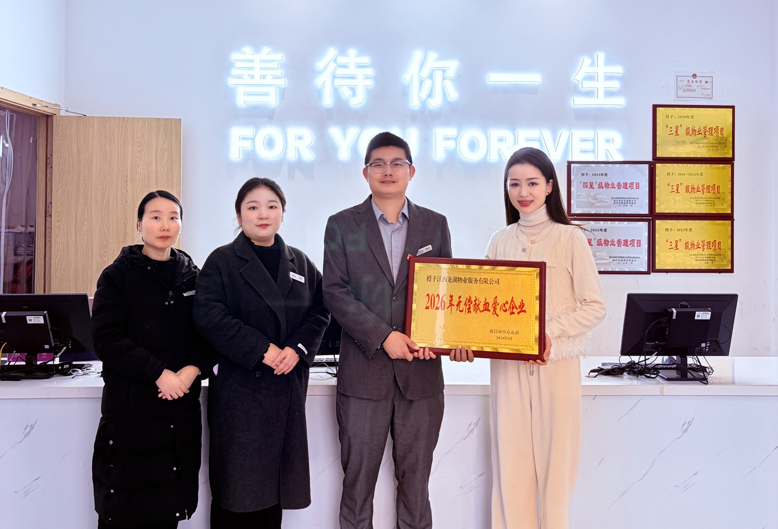 宣讲结束后,我站工作人员现场为龙湖物业授予"2026年无偿献血爱心企业"奖牌。对龙湖物业一直以来在无偿献血公益宣传、爱心传递工作中作出的积极努力与突出贡献给予充分肯定。