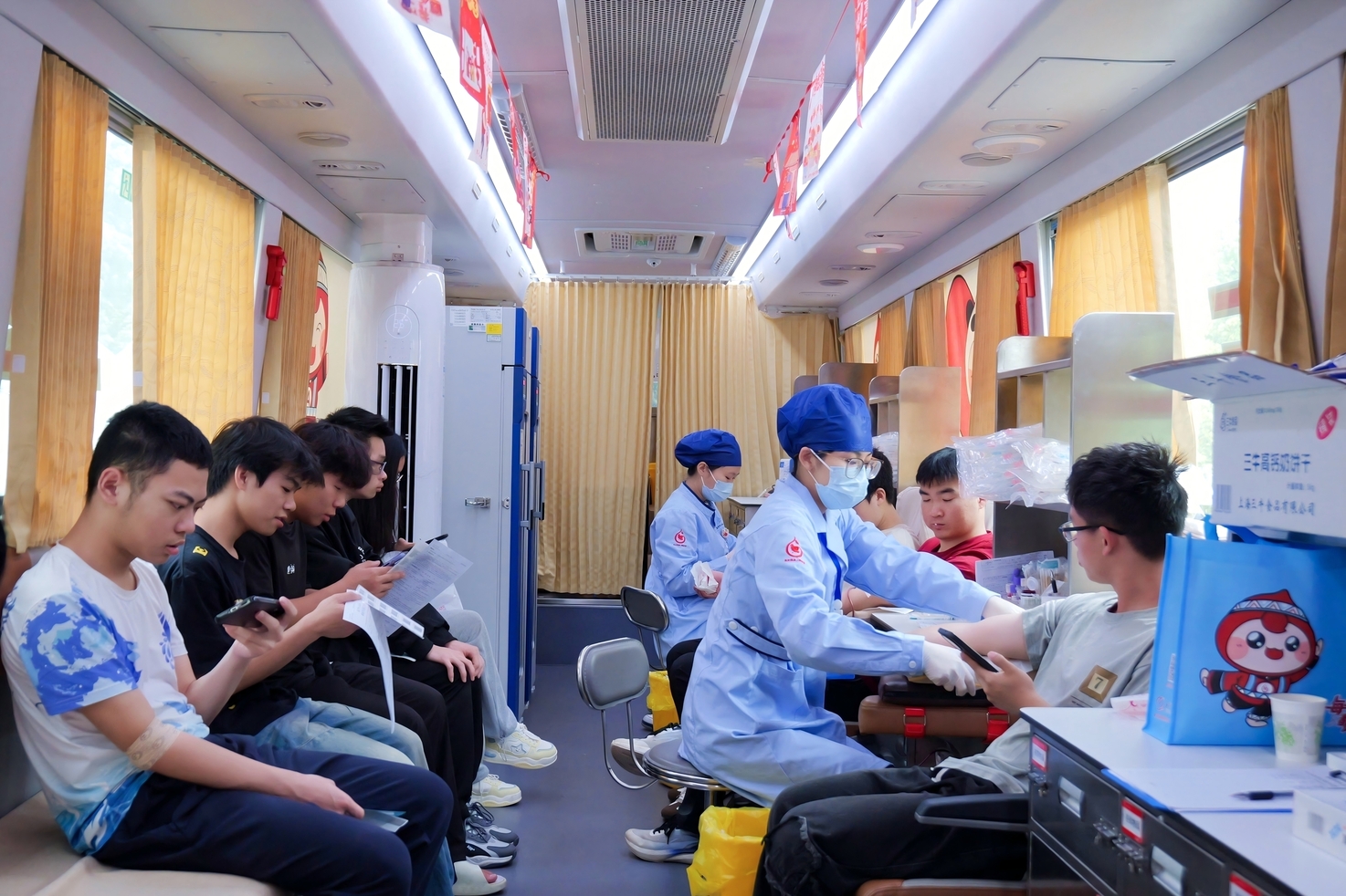 同学们在献血车上排队参与献血