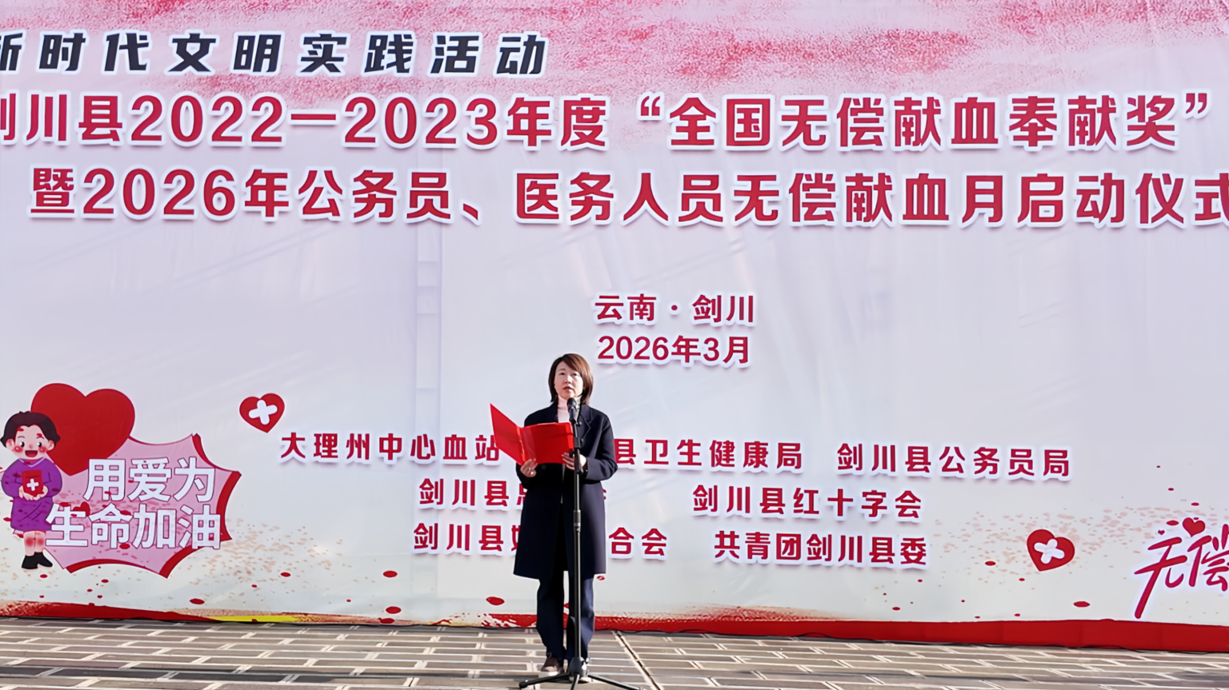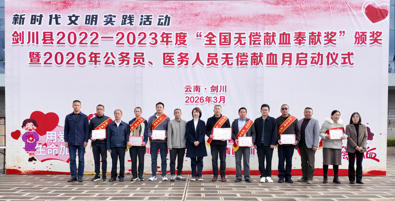为弘扬无私奉献精神,激励更多人投身无偿献血事业,同时推动医务人员和公务员群体发挥带头示范作用,3月18日,由大理州中心血站,剑川县卫生健康局,剑川县公务员局,剑川县总工会,剑川县红十字会,剑川县妇女联合会,共青团剑川县委共同举办的2022-2023年度“全国无偿献血奉献奖”颁奖暨2026年公务员、医务人员无偿献血月启动仪式,在剑川县阿鹏广场隆重举行。