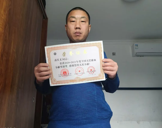 情系第二故乡,热血奉献社会。苗庆义无偿献血时长21年,20次献血7800毫升,荣获了2022-2023年度全国无偿献血奉献奖银奖。
