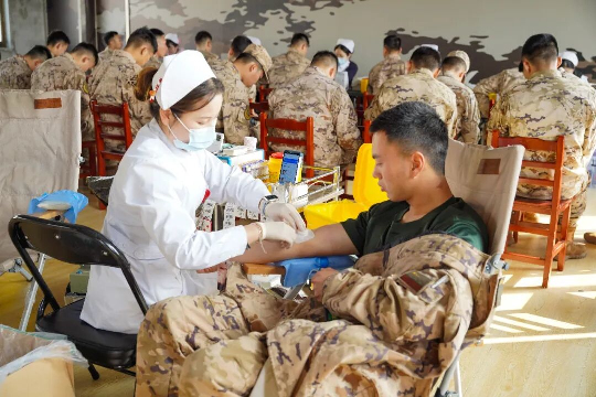 “采血时手可以轻轻握拳再放松,别紧张”、“献完血注意休息”……医务人员一边熟练操作一边轻声叮嘱,温暖的关怀抚平了初次献血者的紧张情绪,也让军民同心的情谊更加深厚。