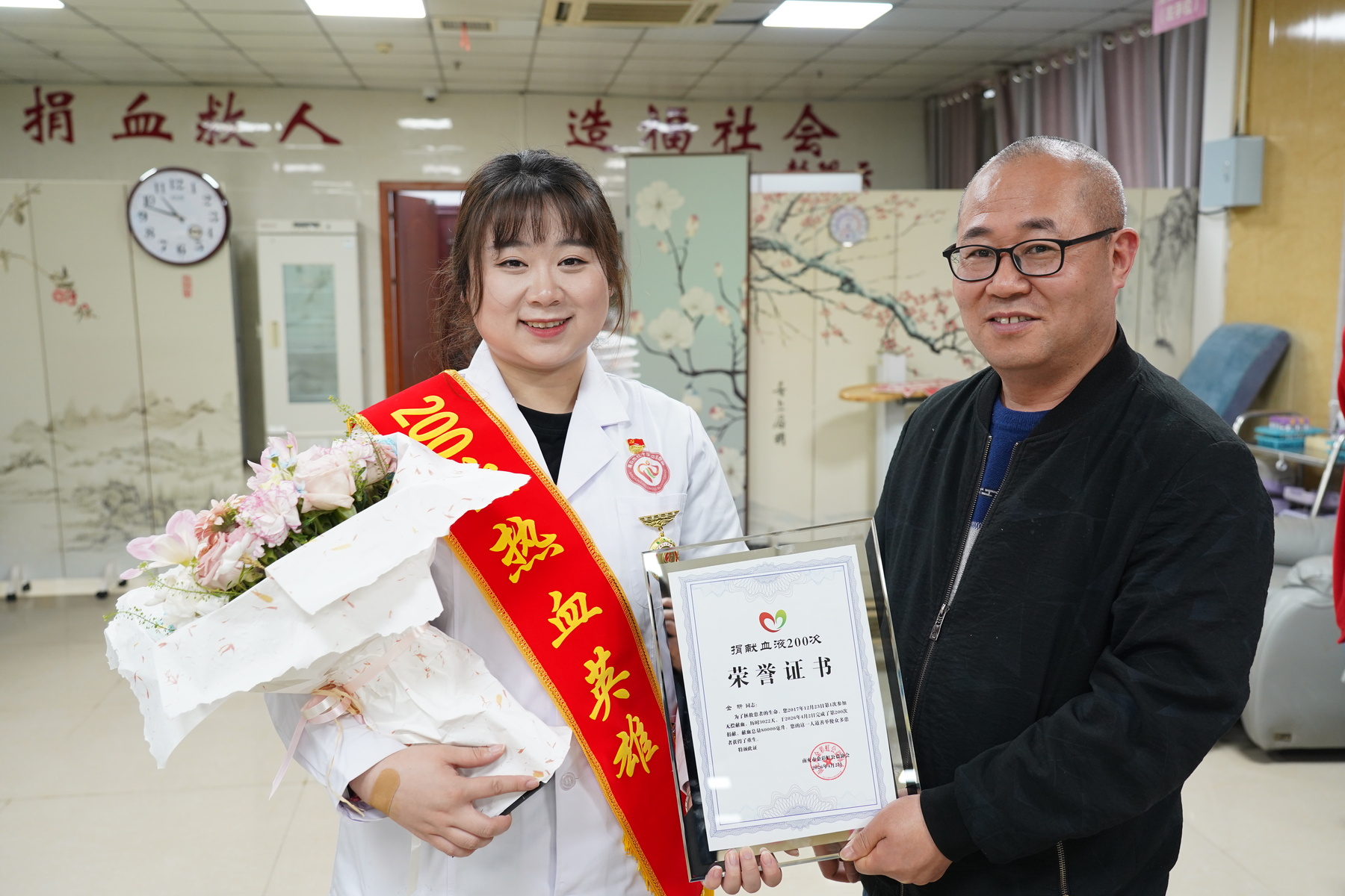 采血现场,温情涌动。郑茹琼站长为金昕送上200次献血纪念杯和鲜花,动情地说道:“金昕是新一代血站人的代表和骄傲,献血200次真的不容易,值得点赞和大力宣传。”。