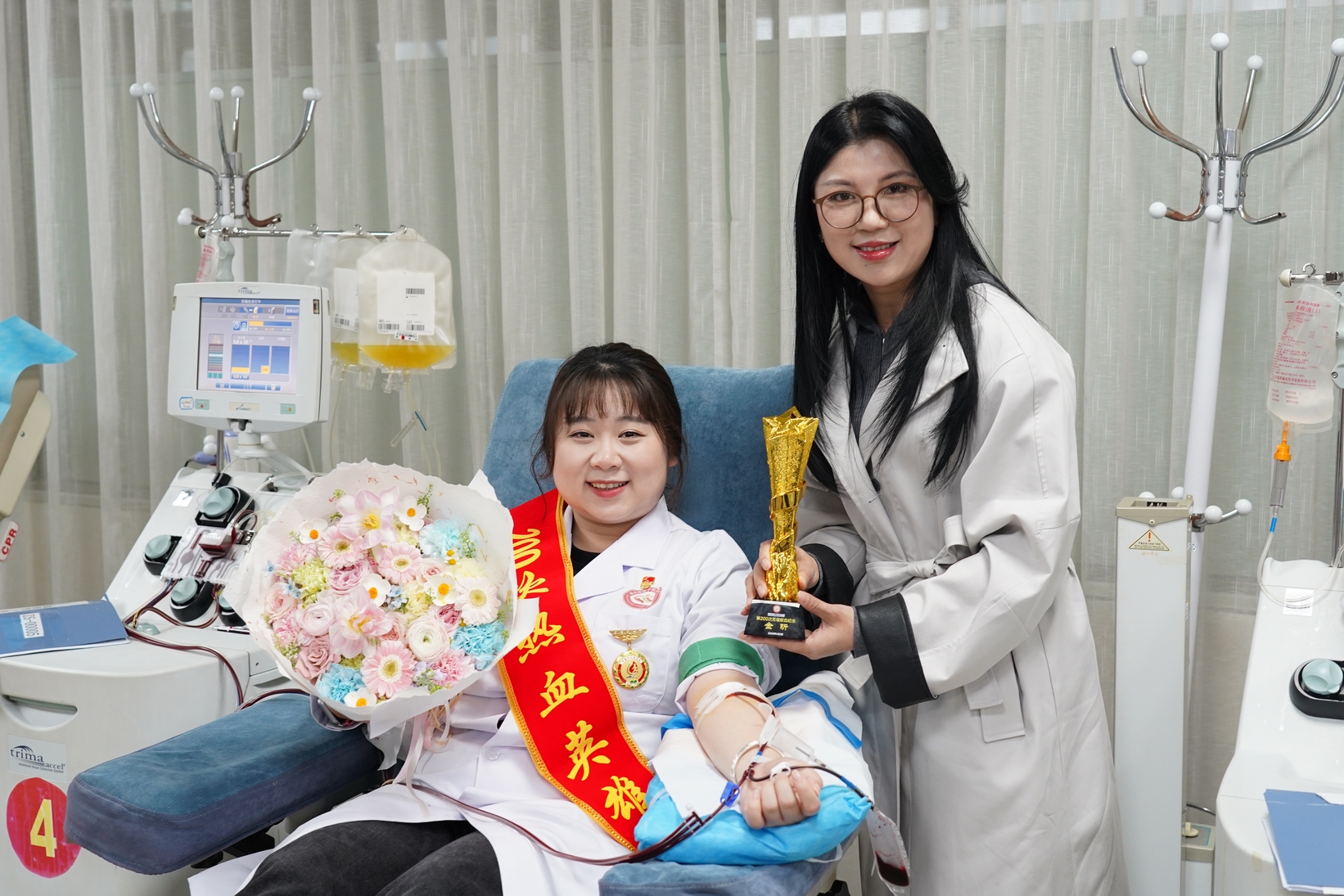 身着白大褂,肩披“200次热血英雄”的绶带,金昕稳稳地坐在献血椅上。这不仅仅是一次献血,更是一段跨越八年时光的奉献史诗。从八年前第一次献血的初心悸动,到如今第200次献血的从容坚定,3022个日夜的坚守,汇聚成了令人动容的爱心答卷。