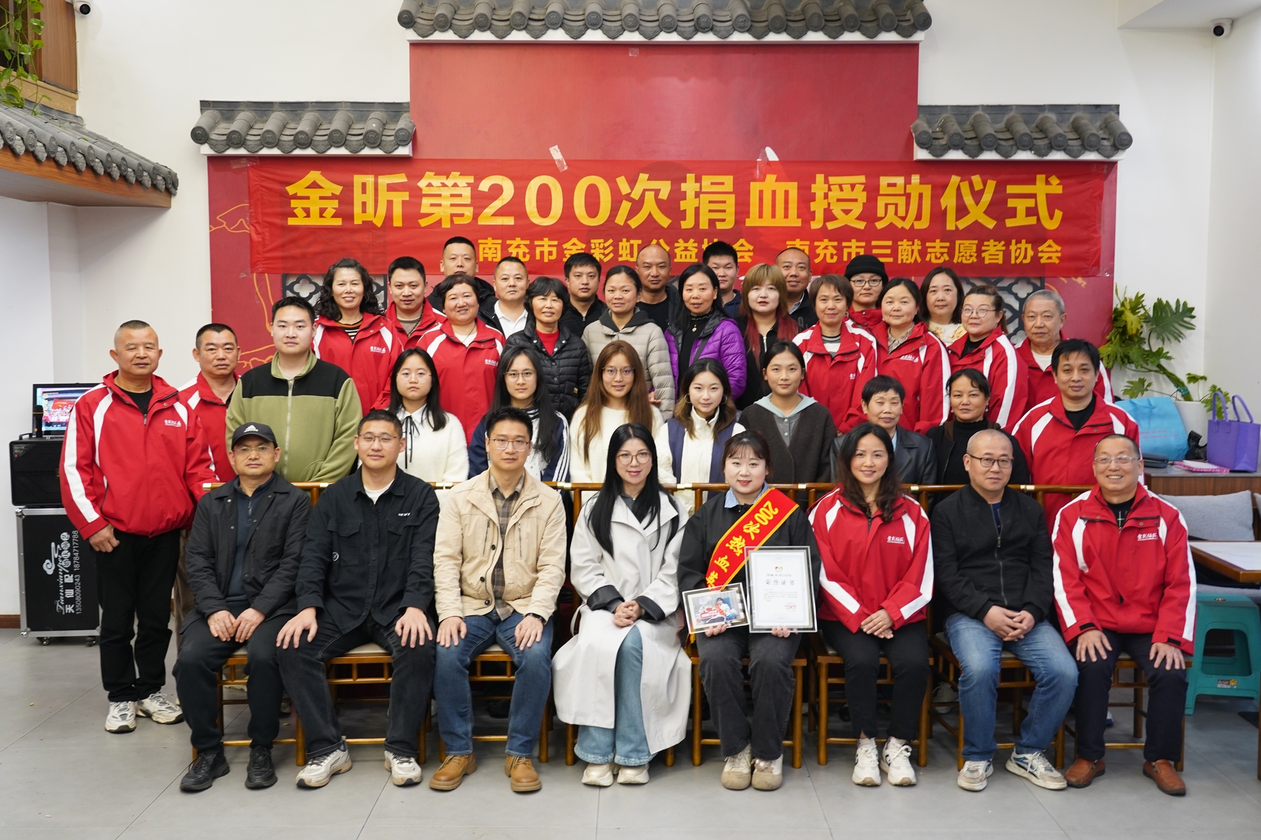 金彩虹协会邓勇副会长为金昕颁发了荣誉证书和专属勋章。更感人的是,血站尹黎、程欣、杨丹等3名职工,邓勇、张淼、何艳、金高明、王志伟、李小新、张一鸣等7名金彩虹志愿者纷纷挽袖,以集体献血的方式“陪跑”金昕,将现场的奉献热情推向高潮。