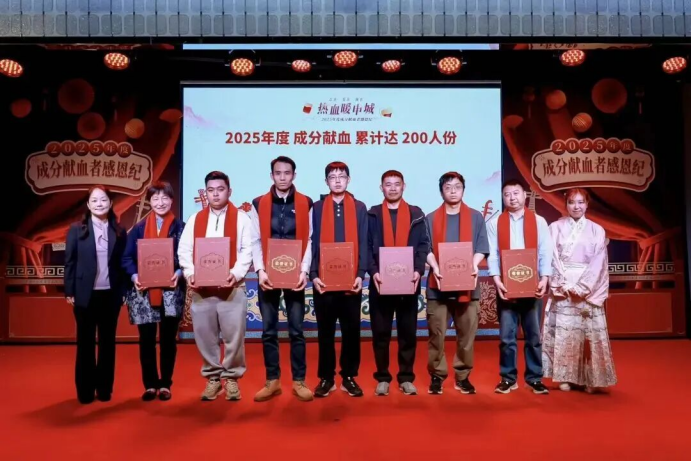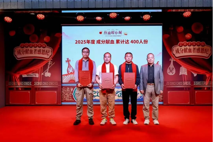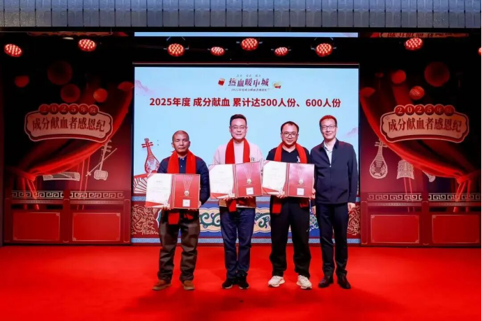 累计成分献血200单位以上,丁先生(右二)作为获奖代表领取证书。