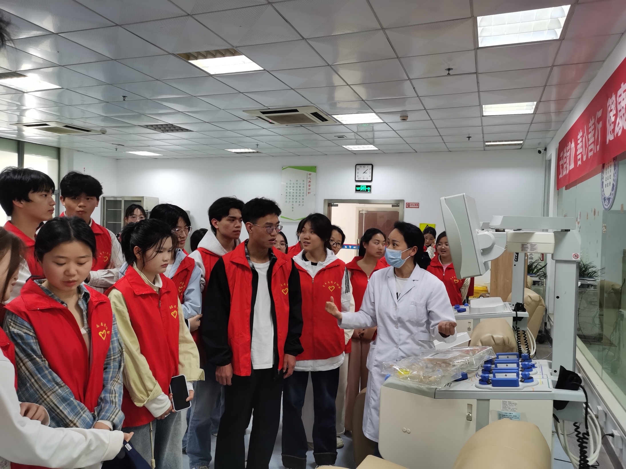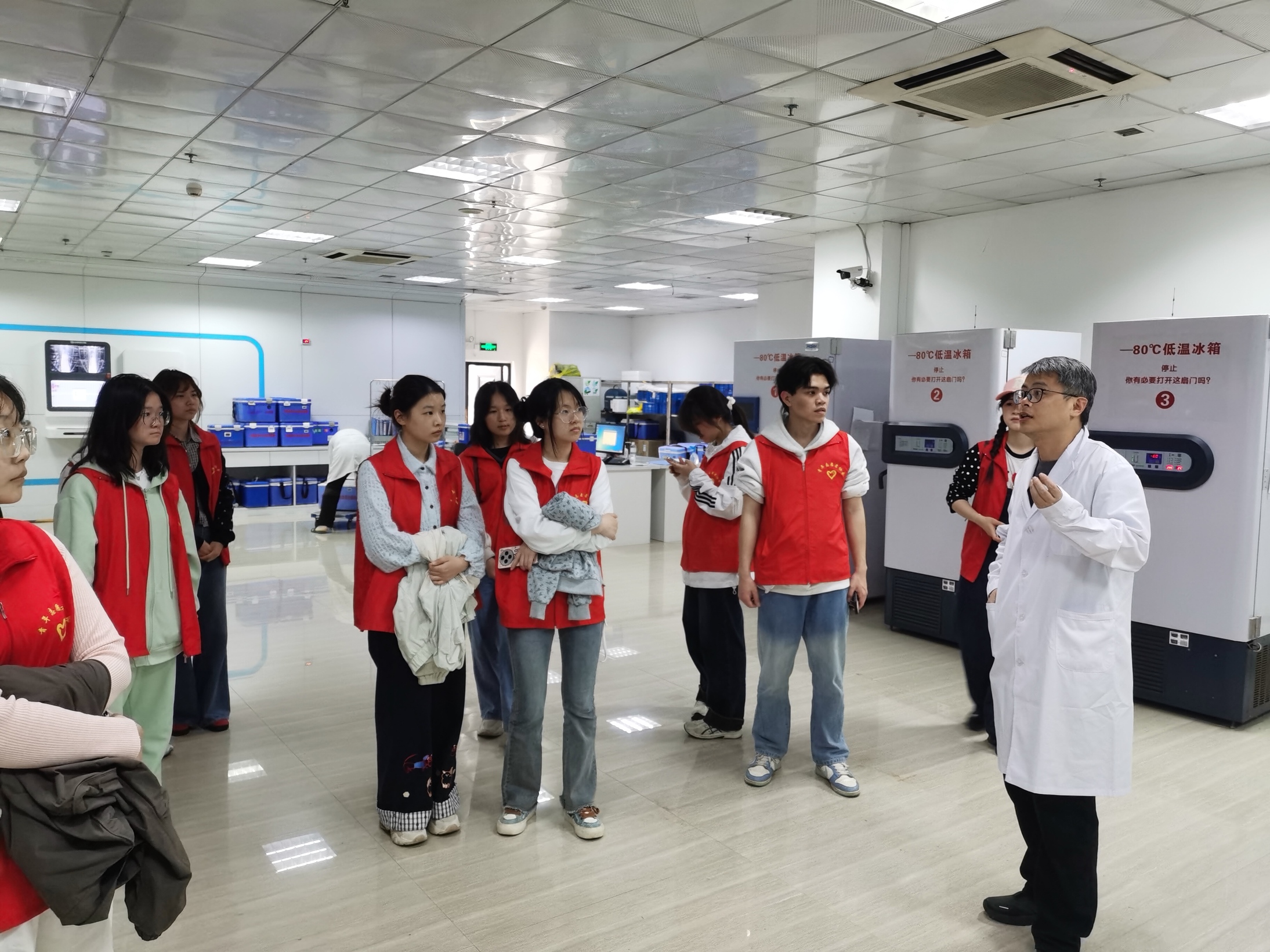 随后,师生们有序走进血液科普馆、采血大厅、成分制备科、检验科、供血科等核心工作区域,实地探访“一袋血的生命旅程”。在采血大厅,同学们观摩了医护人员规范的采血流程,看到献血者们从容奉献的身影,纷纷心生敬意;在成分制备科,大家了解到采集后的全血需经过离心、分离、提纯等多道工序,制成红细胞、血浆、血小板等不同成分,实现血液资源的精准高效利用;在检验科,先进的检测设备、严谨的检测流程,让同学们深知每一袋血液都要经过严格筛查,才能确保临床用血的绝对安全;在供血科恒温恒湿的储血库中,一排排整齐摆放的血液制品,如同守护生命的“生命宝库”,深深震撼着每一位师生。