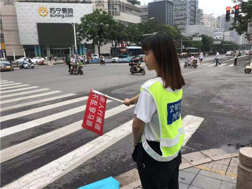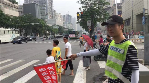 在执勤的过程中,志愿者们手执“不闯红灯、不越线”指挥旗,引导非机动车辆通过路口时遵守交通信号灯,疏导行人走斑马线。遇到老人、小孩经过斑马线时,志愿者们主动上前帮扶。面对闯红灯、等红灯压线等不文明行为时,志愿者们耐心上前进行劝导,建议市民遵守交通规则,文明出行。