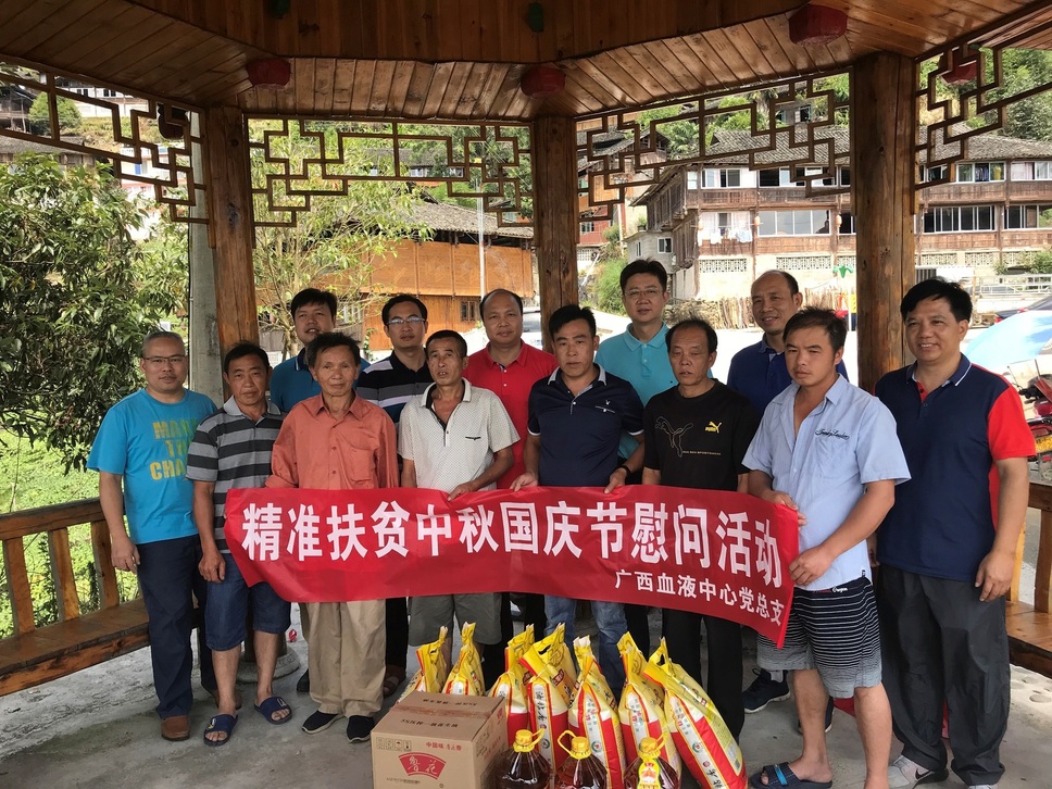 为扎实推进精准扶贫工作,在国庆、中秋节即将来临之际,9月5日,广西血液中心全体领导班子成员、党支部书记等一行9人来到龙胜县泗水乡泗水村走访慰问对口帮扶的贫困户,为每户结对帮扶的贫困户分别送上大米、油等慰问物资,传递组织的关心、关怀和问候。