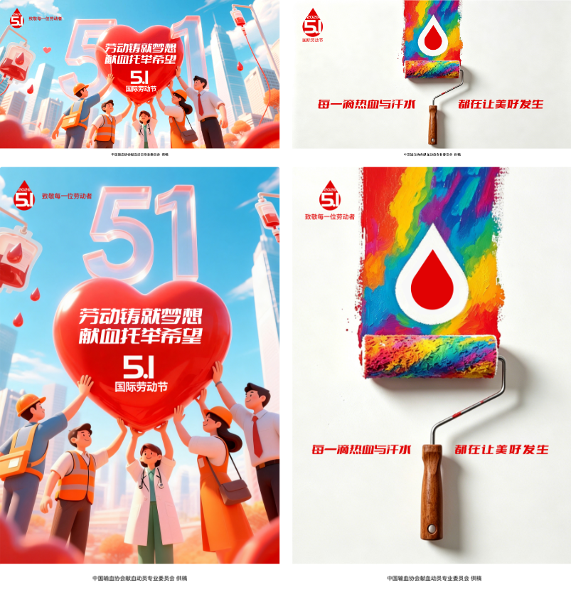 “五一”国际劳动节将至,协会动员委以“劳动铸就梦想·献血托举希望”为灵感,设计推出一套(4张)无偿献血主题宣传画,致敬每一位劳动者与各行各业的献血者;同时感谢各位输血界同仁及广大献血者、志愿者们的无私奉献。