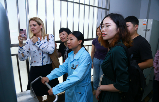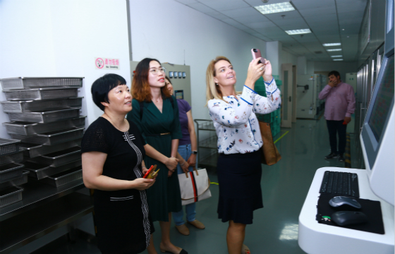 Jennifer Charbonneaux女士一行在血站党总支书记傅杏花的陪同先后参观了机采室、成分科和输研所等业务工作场所。在血液成品库,Jennifer Charbonneaux女士参观了智能血浆库,在工作人员的操作下,详细了解了智能血浆库的运行状况,对我站领先使用智能血浆库,并采用RFID技术实现批量化出入库,提高工作效率,加强精细化管理,确保血液质量安全的做法表示赞叹。在参观过程中,傅杏花书记向Jennifer Charbonneaux女士一行还简要介绍了我站的主要业务工作和研教学情况,也希望Jennifer Charbonneaux女士对我市采供血工作给予指导。