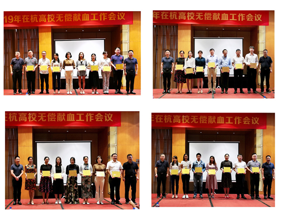 会上,陈江天副主任宣读了《浙江省血液中心关于2018-2019学年在杭高校无偿献血通报表扬的通知》。浙江警官职业技术学院、浙江育英职业技术学院等20所高校获“2018-2019学年在杭高校无偿献血先进集体”荣誉, 杭州医学院、浙江经济职业技术学院等23所高校获得“2018-2019学年在杭高校无偿献血火箭奖”荣誉,万立超、王化明等127位老师获“2018-2019学年在杭高校无偿献血先进个人”称号。浙江省血液中心胡伟主任与陈江天副主任共同为获奖先进集体及个人代表颁奖。