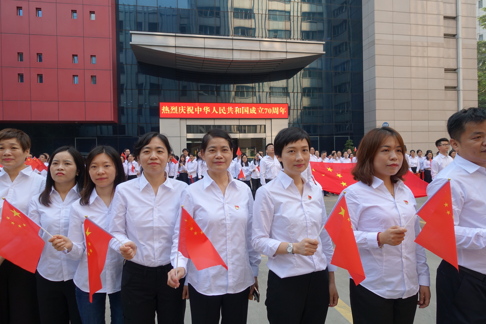 “我和我的祖国,一刻也不能分割,无论我走到哪里,都流出一首赞歌……”轻轻的秋风拂面,缓缓的歌声飘荡在广州血液中心的天空中。9月27日、29日一大早,广州血液中心的全体职工分批参加“迎国庆、颂祖国”大合唱活动。大家皆身穿白衬衫,手里挥舞着五星红旗,在广场上围成心形,在中心领导和领唱人员的带领下集体合唱《我和我的祖国》。现场红旗飘扬,歌声环绕,气氛热烈,展现了中心职工对祖国的热爱。歌颂、赞扬祖国伟大、壮丽、富强的面貌,热烈庆祝中华人民共和国成立70周年。