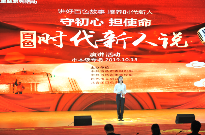 为培育和弘扬社会主义核心价值观,庆祝新中国成立70周年、百色起义90周年,讲好百色故事、培养时代新人,市精神文明办于10月12日在百色民族高中礼堂举办守初心、担使命-百色“时代新人说”主题演讲交流活动,市中心血站派出陆彩亿同志作为选手参加演讲活动,表现优异。
