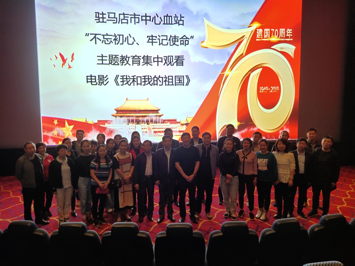 为深入开展“不忘初心、牢记使命”主题教育,驻马店市中心血站党支部于10月12日下午,组织全体党员观看爱国电影《我和我的祖国》。
