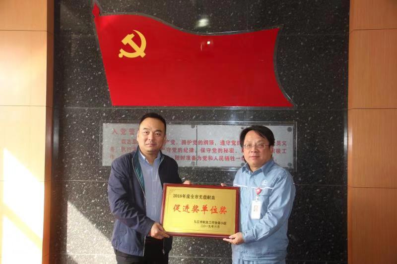 10月31日上午,九江市中心血站党支部书记王晖、站长胡佑华、献血科主任张雯一行来到中国石化九江分公司,将2016-2017年度“全国无偿献血促进奖单位奖”及2018年度“全市无偿献血促进奖单位奖”获奖文件、奖牌送上。此奖项是国家对无偿献血工作作出突出贡献单位给予的最高奖项。