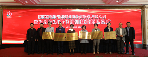 2019年10月29日,首批“浙江省医疗机构输血科(血库)从业人员省级岗位规范化培训基地”授牌仪式在杭州举行。浙江省卫生健康委医政医管处副处长徐飞鸿、中国输血协会理事长朱永明、浙江省输血协会理事长胡伟、浙江省输血协会副理事长兼秘书长王建敏等领导为获此称号的医疗机构授牌。