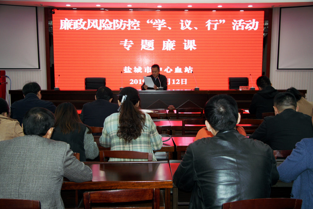 为扎实开展廉政风险防控“学、议、行”活动,增强干部职工廉洁自律意识,规范干部职工履职行为。11月12日上午,盐城市中心血站开展讲专题廉课活动,站中层干部、重点岗位人员、各科室小组长参加活动。活动由站长葛健民主持。