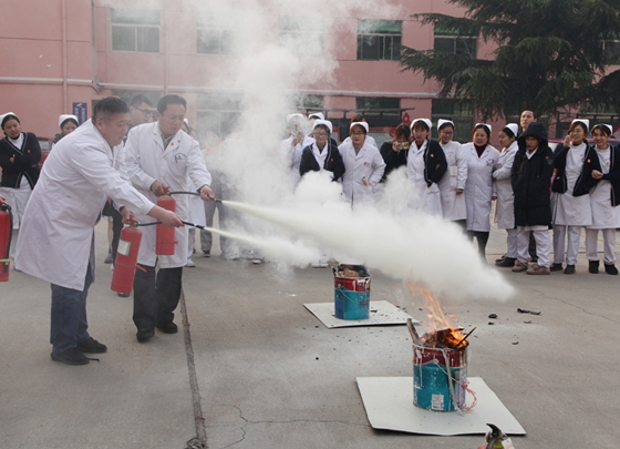 血站医护人员现场演练灭火器的使用要领(于瑞杰 摄影)