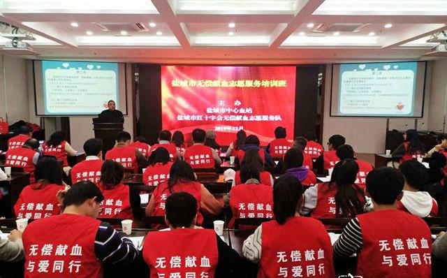 12月16日下午,盐城市举办无偿献血志愿服务培训班,来自市区各行各业及驻盐院校的80位志愿者骨干参加了培训。