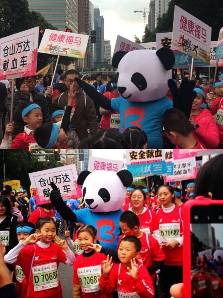 在热情洋溢的人群中,有一支特别的队伍——无偿献血宣传方阵。方阵由无偿献血者、献血服务志愿者以及福建省血液中心工作人员组成。他们头戴“我爱福州”发带、脸贴爱心国旗,高举“安全献血健康福马”及市区内十个献血点手举牌,由代表A型、B型、O型、AB型献血者的“熊猫”领队,一同在福马赛道上传播健康生活理念。