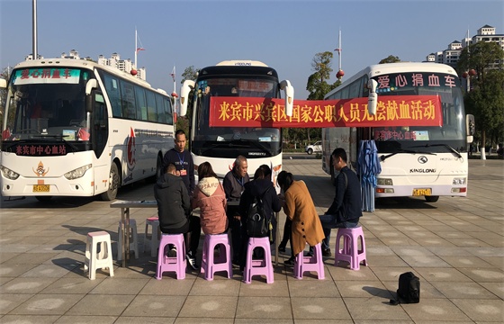 2019年11月22日,来宾市兴宾区政府组织开展2019年国家公职人员无偿献血活动,82人参与无偿献血,累计采血26800毫升。