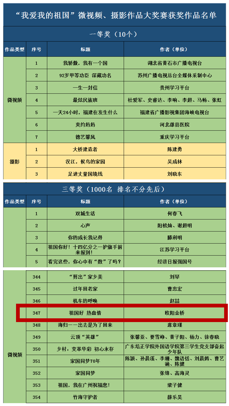 据悉,我爱我的祖国”微视频、摄影作品大奖赛活动时间从9月中旬持续到11月底。活动受到社会各方面广泛关注,全国各地数万名视频和摄影专业人士和业余爱好者踊跃参与、积极投稿。截至11月30日,共收到参赛作品82134件,其中微视频作品11767件,摄影作品70353件。