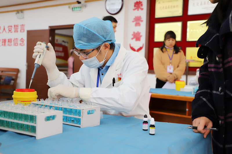 护士小姐姐在认真细致地进行血液采集,现场的献血者也是血站的职工,大家在参与比赛的同时,也用实际行动践行了“不忘初心,牢记使命”主题教育学习成果。
