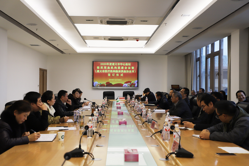 2019年12月30日,在市中心血站8楼会议室隆重召开与医疗机构的联席会议暨2020年度《遵义市医疗机构临床供血协议》签订仪式。出席会议的有遵义医科大第一、二附属医院、遵义市第一人民医院、贵州航天医院等15家医疗机构分管业务的副院长、输血科主任。市中心血站党总支副书记、副站长付胜,副站长张承伟及相关科室负责人参会。会议由副站长张承伟同志主持。