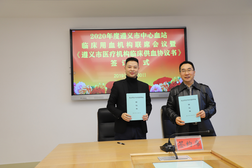 会上,副站长张承伟代表遵义市中心血站,与15家临床用血医疗机构签订2020年度《遵义市医疗机构临床供血协议》。