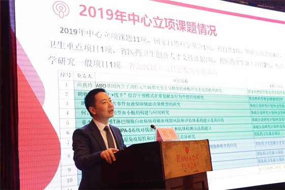 最后,中心主任胡伟作了2019年中心科研工作的专题报告。胡主任肯定了“十三五”以来中心科研工作取得的成绩,他指出,中心科研水平虽然在行业内处于领先地位,但仍存在科研力量薄弱、后继人才不足等问题。他希望经过5年建设,在学科建设、科学研究、成果转化、人才培养、社会服务、国际交流和合作等方面能取得更大突破,有效提高血液保障能力和血液安全,创建国家一流血液中心,为国家的经济建设和社会发展服务。