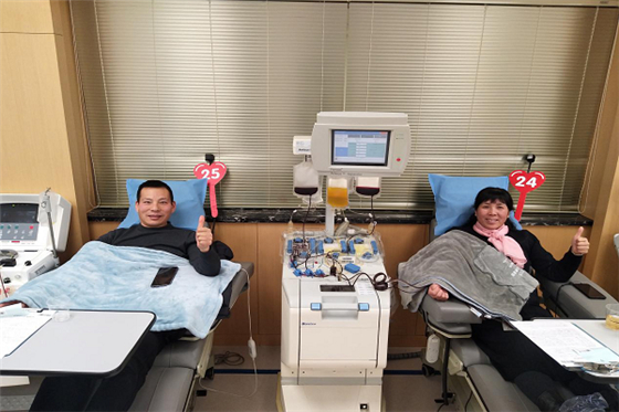 李保栋和周义芳夫妇二人一早也赶到了血液中心,夫妻俩一直都是相伴来捐献血小板的。夫妻俩一致表示,加入无偿献血的队伍,定期来捐献血小板是件非常平常的事情。李保栋告诉工作人员,他从2005年就开始献全血,后来2007年了解到可以献血小板,只要周末节假日休息就会到血液中心来献血小板。妻子也是在他的鼓励下加入无偿献血队伍。妻子已经拿到了无偿献血奉献奖金奖,而自己这两年由于工作原因需要在湖州等地来回跑有时不合格才拿到银奖。选择新年第一天来捐献血小板觉得非常有意义,希望尽自己所能帮助他人。迄今为止,李保栋累计献血6800ML,这是他第22次参加无偿献血。他告诉工作人员本来可以献更多次的,但因有几次准备不充分,献血前检测没合格,这次好不容易合格了,夫妻俩终于又可以一起了。妻子周义芳累计献血13400ML,这是她第33次参加无偿献血了。过完春节,李保栋夫妇就要升级为爷爷奶奶了,他们说可能会暂时没时间过来献血,等忙完了这一阵还会继续加入献血队伍救助患者。祝福这对可亲可敬的夫妇二人!