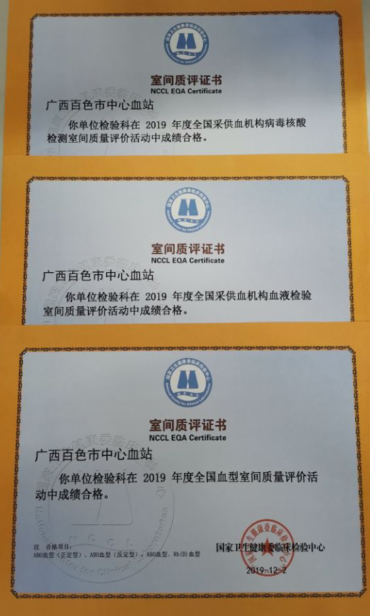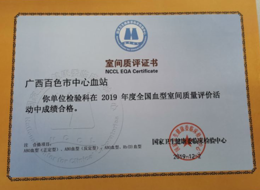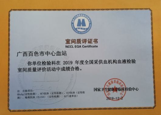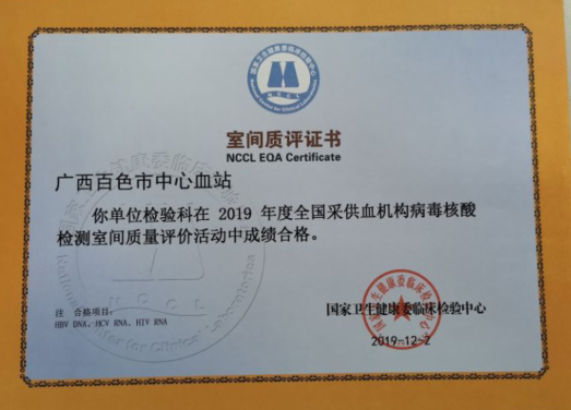 近日,百色市中心血站收到国家卫生健康委临床检验中心颁发的2019年度全国采供血机构实验室室间质评合格证书,这表明百色市中心血站实验室顺利通过全国采供血机构血液检验室间质量评价。