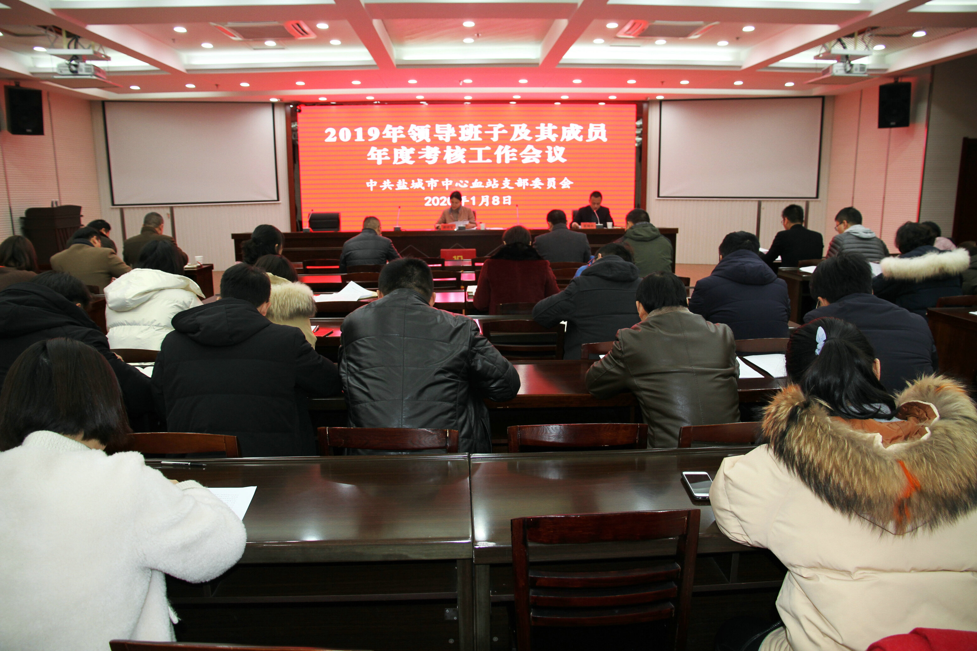 1月8日上午,盐城市卫健委组织人事处处长唐晓军一行3人对盐城市中心血站2019年领导班子及成员进行年度考核,血站领导班子和部分干部职工40多人参加了会议。
