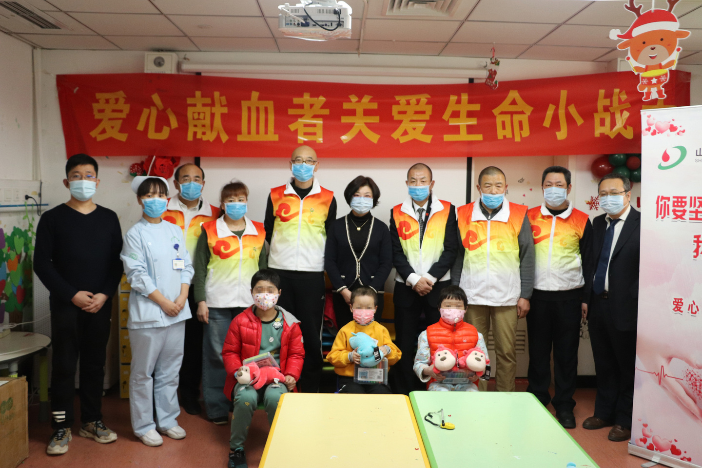 为了呼吁广大群众积极“撸起袖子”献热血、关注小儿血液病,并尽可能帮助血液病儿童,1月11日新年伊始,省血液中心组织无偿献血志愿者走进省千佛山医院小儿血液病科,提前为白血病患儿送上春节的祝福。志愿者们也通过此次活动深刻了解了无偿献血的重要性、紧迫性和使命感。省血液中心副主任李蓬、业务科科长朱海峰陪同无偿献血者参加了此次活动。
